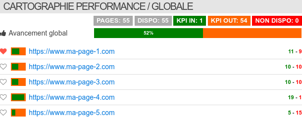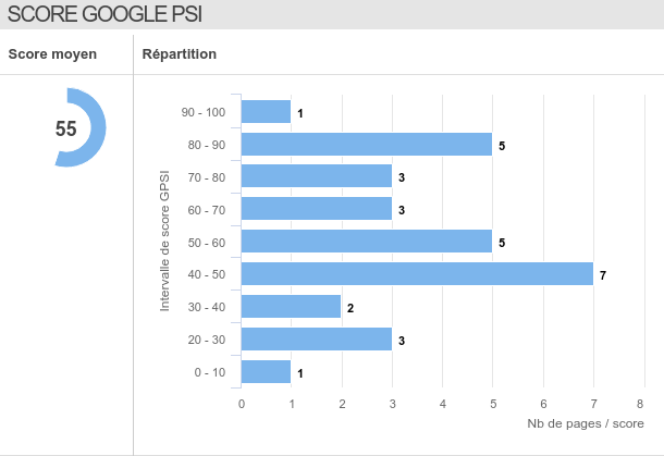 Grâce à une présentation intuitive, vous pouvez immédiatement voir les pages les moins performantes de votre site, et connaître ainsi le pourcentage de pages qui ont un fort potentiel d'amélioration.